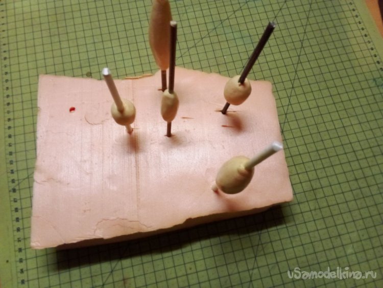 Оставляю поплавки сохнуть воткнутыми в кусок пеноплэкса.