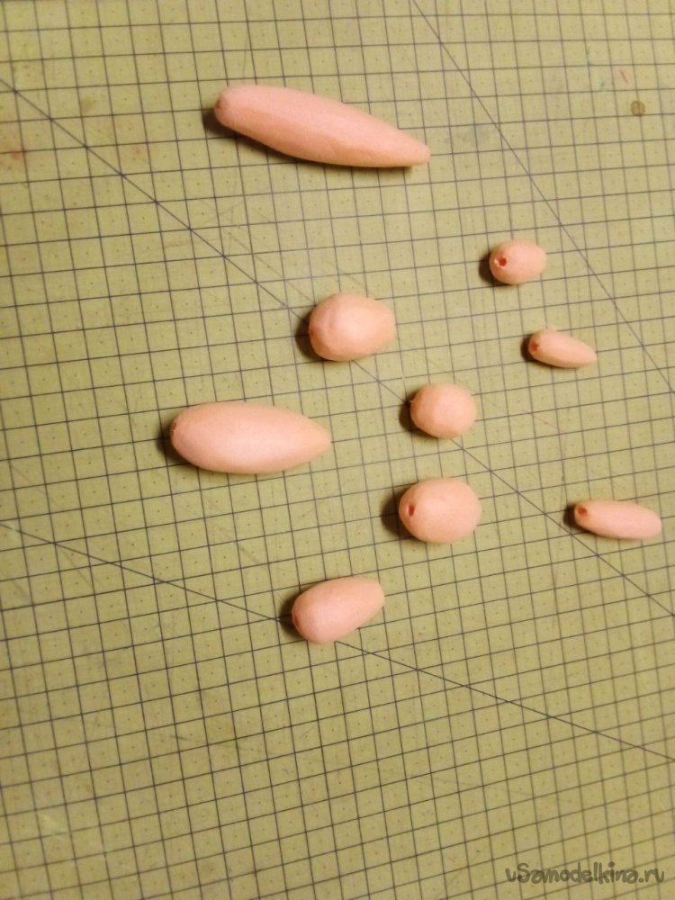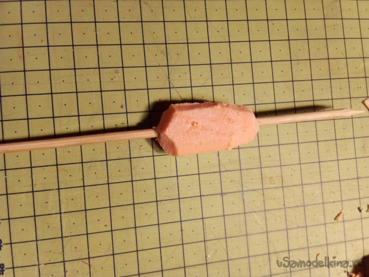 Каждый из этих брусочков нужно проткнуть спицей строго по центру. Важно делать это до придания заготовке формы, так как попасть в центр поплавка очень сложно, и спица выйдет где-то сбоку.