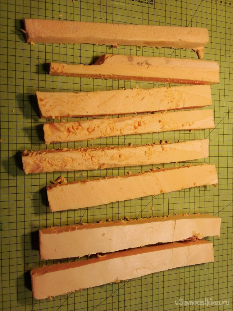 Для начала кухонным ножом нарезаю пеноплэкс на полоски, толщиной приблизительно 35-40мм