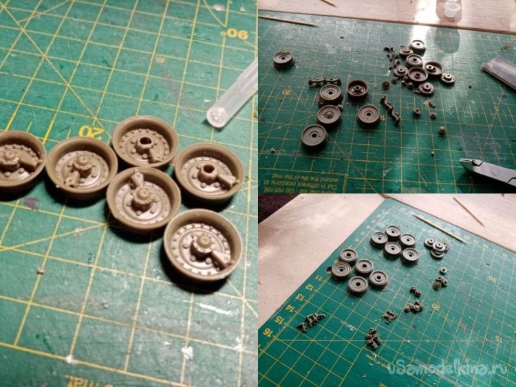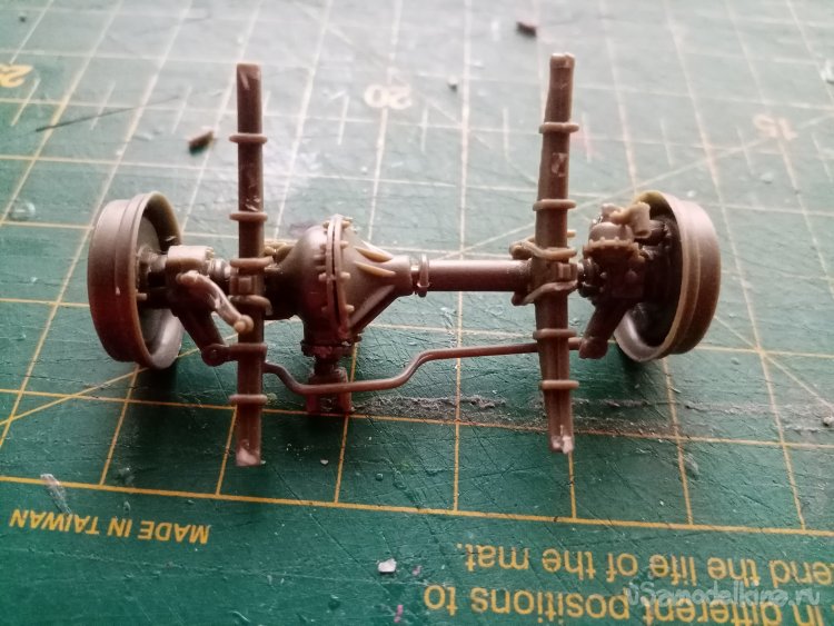 Перехожу к колесным дискам с механизмами подкачки. Очень много деталей, которые обеспечивают подвижность колес. Типа все должны крутиться. Но есть идея установить машинку на подставку. Кататься не будет. Потому заклеиваю все оси намертво. Так надежнее.