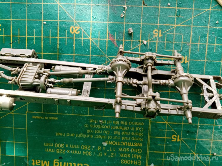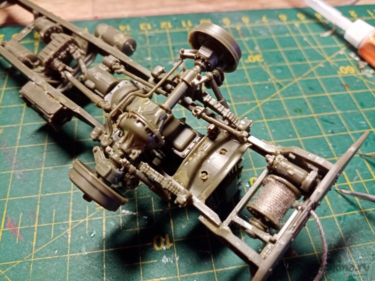 Лезу в дебри передней подвески. Она тоже ведущая. Плюс все рычаги и тяги управления. Механический привод лебедки тоже есть в нужном месте. Устанавливаю коробки раздачи на задний мост на раму.