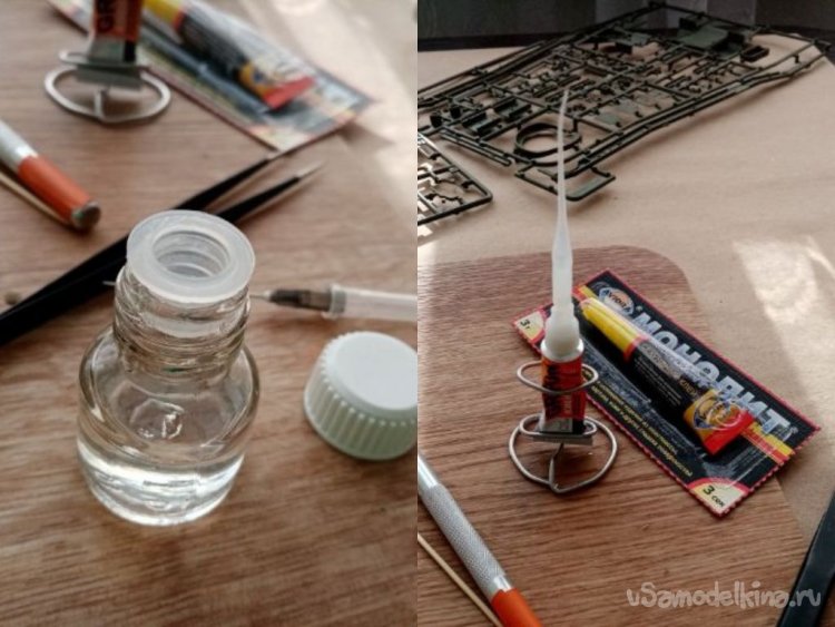 В работе использую два типа клея. По месту применения. Клеем для моделей удобно приваривать пластиковые детали, но долго ждать склейки. Циакрином хорошо и мгновенно соединять мелочь всякую. Клей для сборки пластика и циакрин. На тюбик с циакрином надеваю тонкую трубочку, купленную на алишке. Специально под клей, очень удобно пролазить во всякие трудно доступные места. И вижу, этих мест в этой модели будет огромное количество.