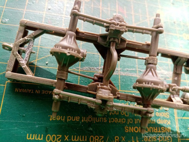 Затем достаточно сложная деталь, рама со всем навесным устройством. Процесс окраски не простой. Приходится поворачивать деталь под разными углами. Краска должна лечь во все уголки. Просушив черную от тамии в нетерпении обул колеса. Смотрится очень хорошо. С окраской пока небольшой перерыв.