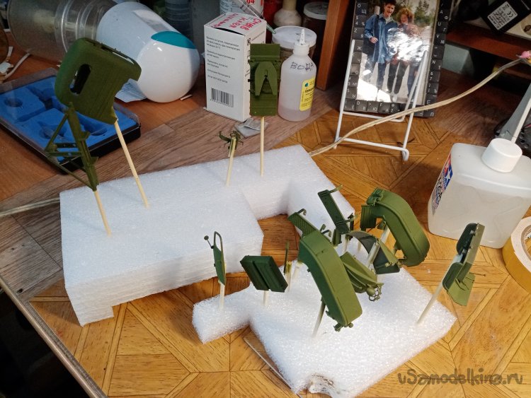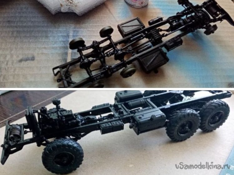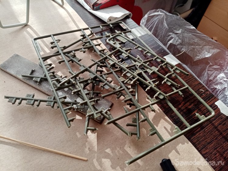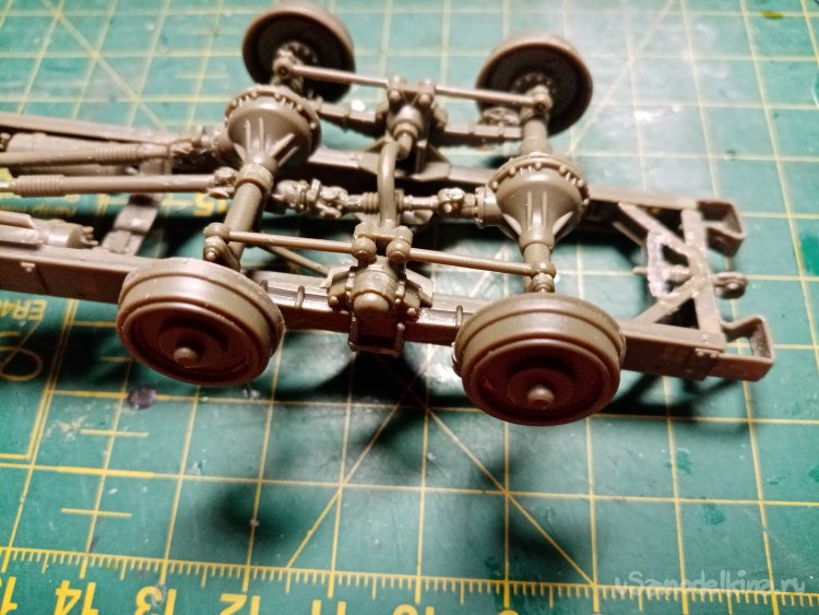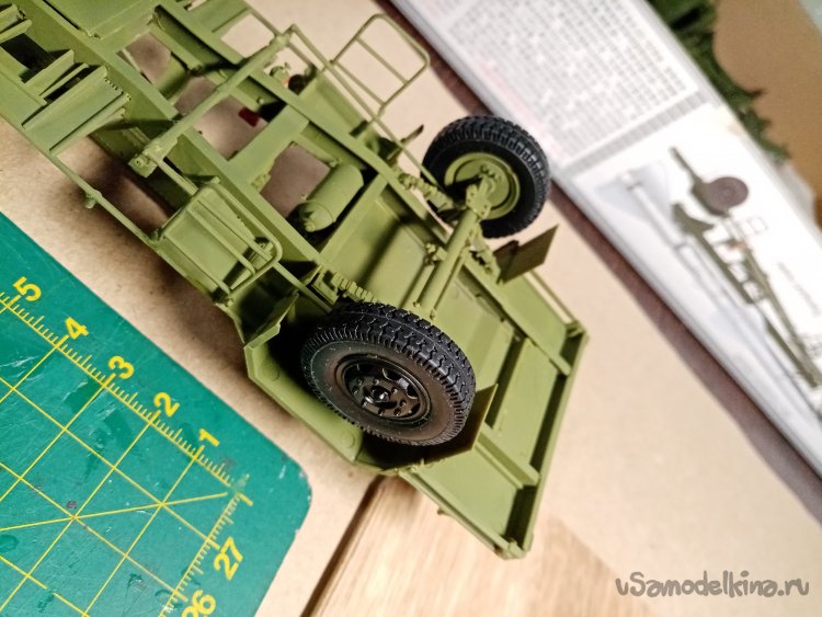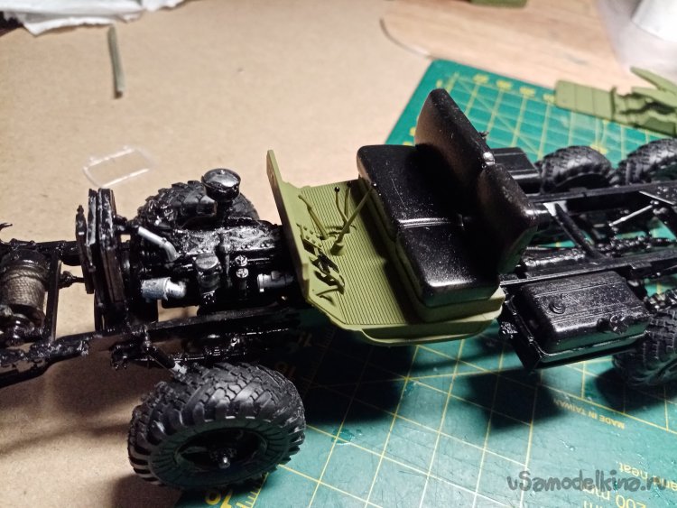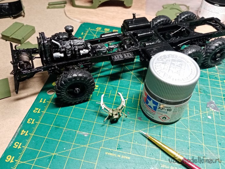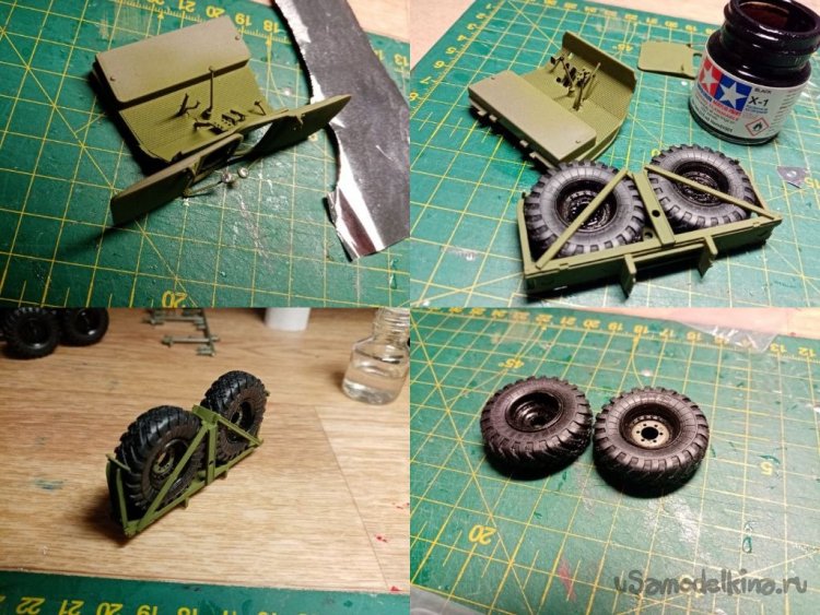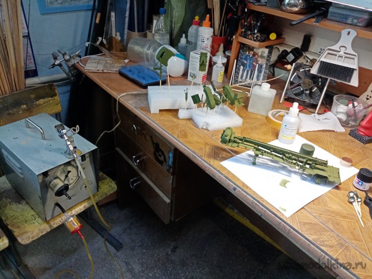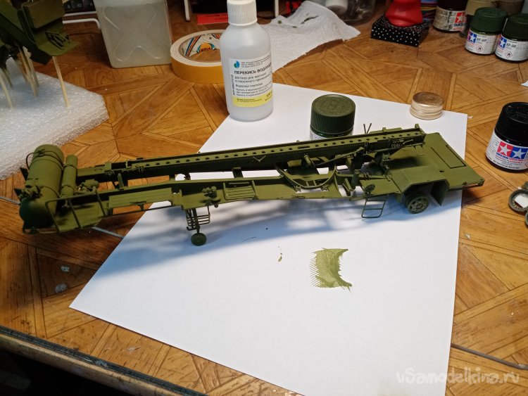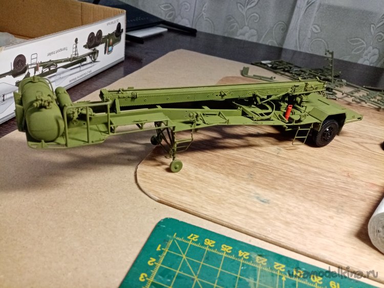 Еще одно перемещение в моделку на покраску второй партии деталей. Перехожу на зеленую. Окрасил прицеп с рамой.