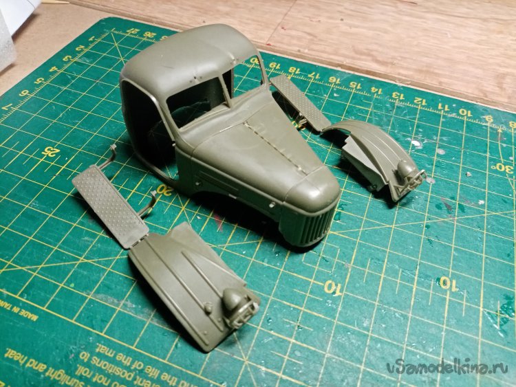 Установил парочку боковых капотов. Они открываются вверх на шомпольных петлях. И фиксируются внизу ручками. На настоящей машине их можно полностью снять. Впереди капот с решеткой радиатора. Мощные крылья с подножками. Фары с защитными решетками. В армии еще застал такие машины снятые с хранения. Собираю и вспоминаю, как, что и где.