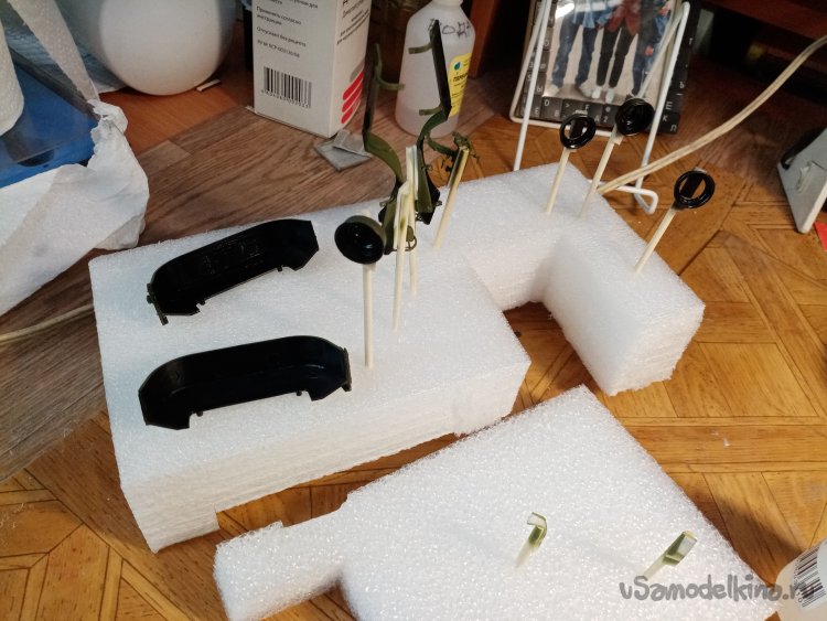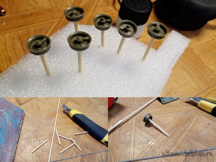 Начинаю подготовку к окрашиванию. Закрепляю колесные диски на зубочистках. Удобно держать при покраске. Удобно сушить, воткнув в твердый упаковочный поролон.