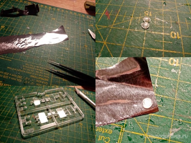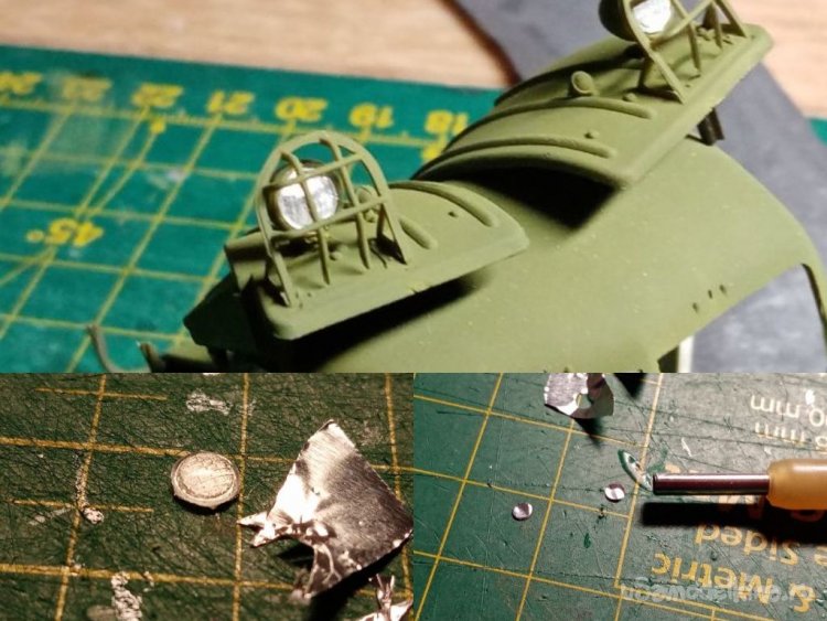 Далее фары и стекла кабины. Внутрь стекла устанавливаю кружочки алюминиевой фольги. Все по живее блестеть будут.