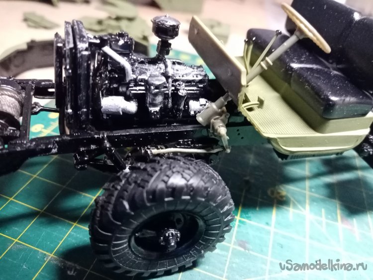 Немного облагородил двигатель. Смывкой и сухой кистью под алюминий. Установил пол кабины. Колеса смотрятся отлично.