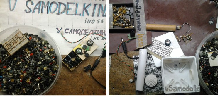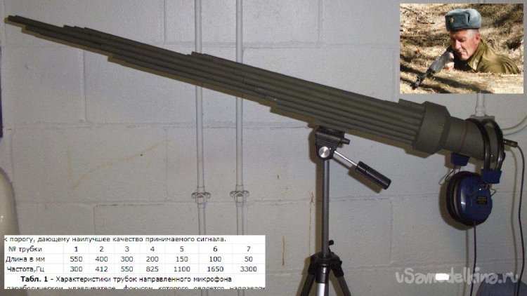 Эта конструкция полуэкспериментальная, предназначена не для повторения, а так - поделиться опытом. Возникла у людей такая проблема - записать или хотя бы прослушать звук в одном месте, где очень сильные помехи, в основном в виде музыки. Если коротко - столик, с одной стороны эстрада. Была мысль использовать остронаправленный на источник интересующего звука микрофон, но остронаправленный микрофон - довольно большое и громоздкое чудовище. Вот внизу трубчатый органный остронаправленный микрофон (почти как пулемет).