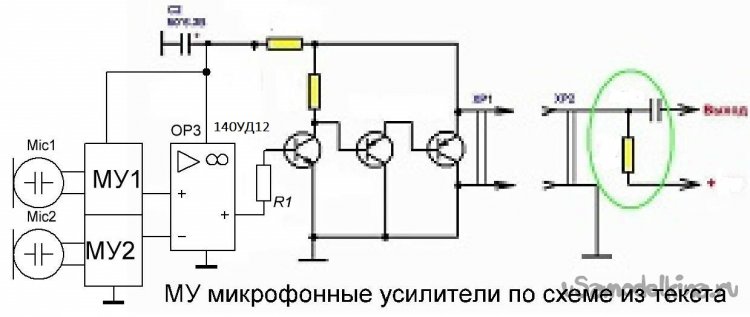 Так как у нас мешающий звук приходит только с одной стороны, от колонок, то возникла такая мысль - вычленить мешающий звук и потом электроникой вырезать его из общего сигнала. Легко - общий микрофон с круговой направленностью, вспомогательный - направленный, смотрит на колонки. Сигналы от них суммируются в противофазе, т.е. сигнал от вспомогательного микрофона вычитается из общего сигнала. При этом: 1 - микрофоны должны быть рядом (это основы электроакустики - уменьшить фазовые сдвиги и т.п.); 2 - питание схемы должно быть стационарным и, желательно (для уменьшения заметности), по сигнальной линии. От себя я предложил поставить полосовые фильтры речевого сигнала, 300 - 3000 Гц, как в древних телефонах. А чего, разборчивость речи там была... скажем так - удовлетворительная. Со схемотехникой проблем нет - фантомное питание микрофонов, полосовые фильтры, сумматоры-режекторы - тут никаких открытий делать не надо. Про такие вещи в свое время было неплохо написано в книге "Шпионские штучки", когда-то она была в свободной продаже. Да и других источников информации хватает.