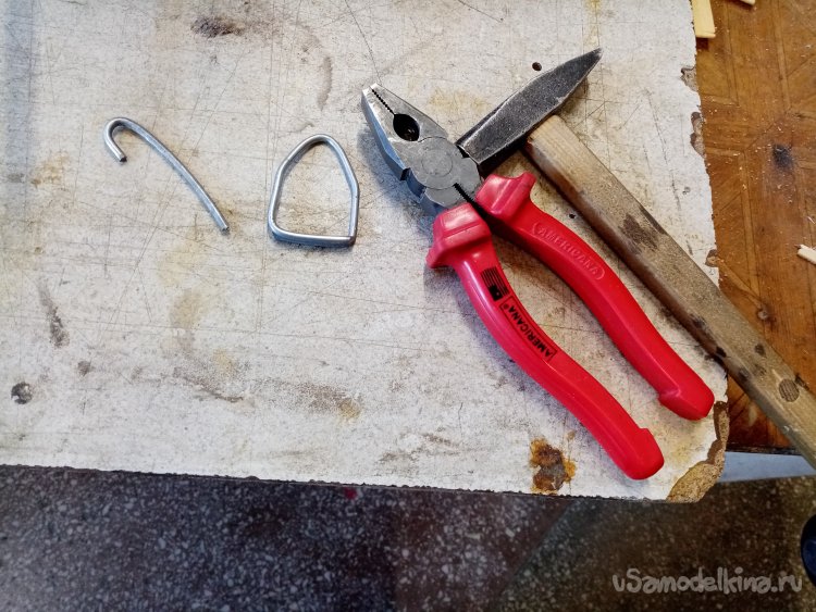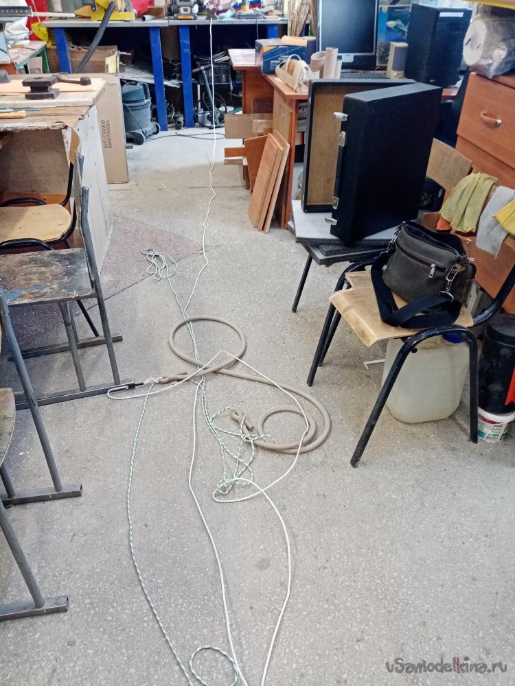 Сейчас нужно изготовить основную деталь. Резиновый амортизатор-бросатель. Колечки для зацепа буду делать из ручек пластиковых ведер. Подарил крудок плетения. От ведер отрезаются ушки и ручки и очень красиво заплетаются шнуром. Получаются великолепные горшки для комнатных растений. А железки весьма хорошего диаметра прибрали мы. С прицелом на стойки шасси для достаточно больших моделей.
