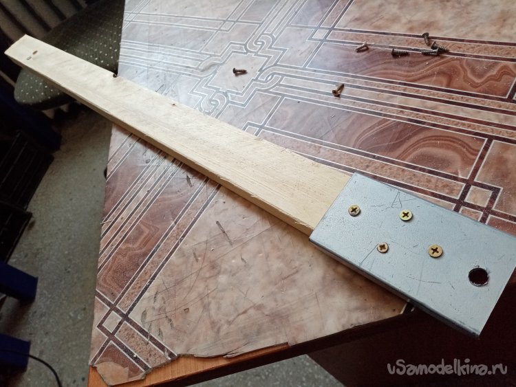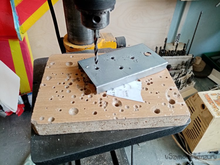 На кончике педали металлическая накладка из подходящего железного профиля. Отверстия для штока и шурупов крепления сверлю на станке.