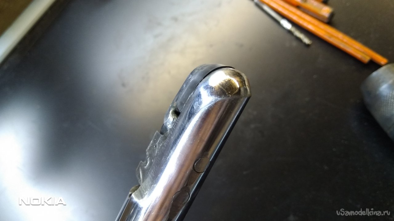 Направляющую для лобзика прикрутил только одной струбциной, от вибрации естественно направляющая сдвинулась, и рез получился кривой. Пилу отрезную я так и не восстановил после наводнения, пришлось заняться ей. Снаружи я отмывал от ила, мойка высокого давления, к сожалению, не вымывает в скрытых полостях, ил был даже в выключателе. Разобрал, почистил контакты. Попутно сделал металлическую кисточку, удобно из старой подводки гибкой делать. Там нержавеющая проволока тонкая, болгаркой легко отрезается кусочек необходимой длинны, надевается на кусочек палочки, и у вас готовая металлическая кисточка. В магазине такую днём с огнём не сыскать, а сделать пара минут.