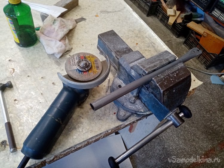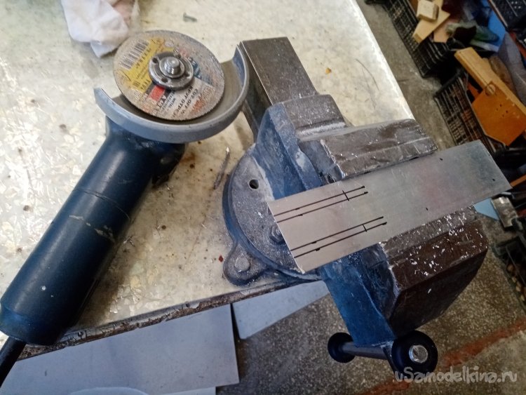Нужно прорезать палы в заготовках. Зажимаю в слесарные тиски болгарку в руки и вперед!