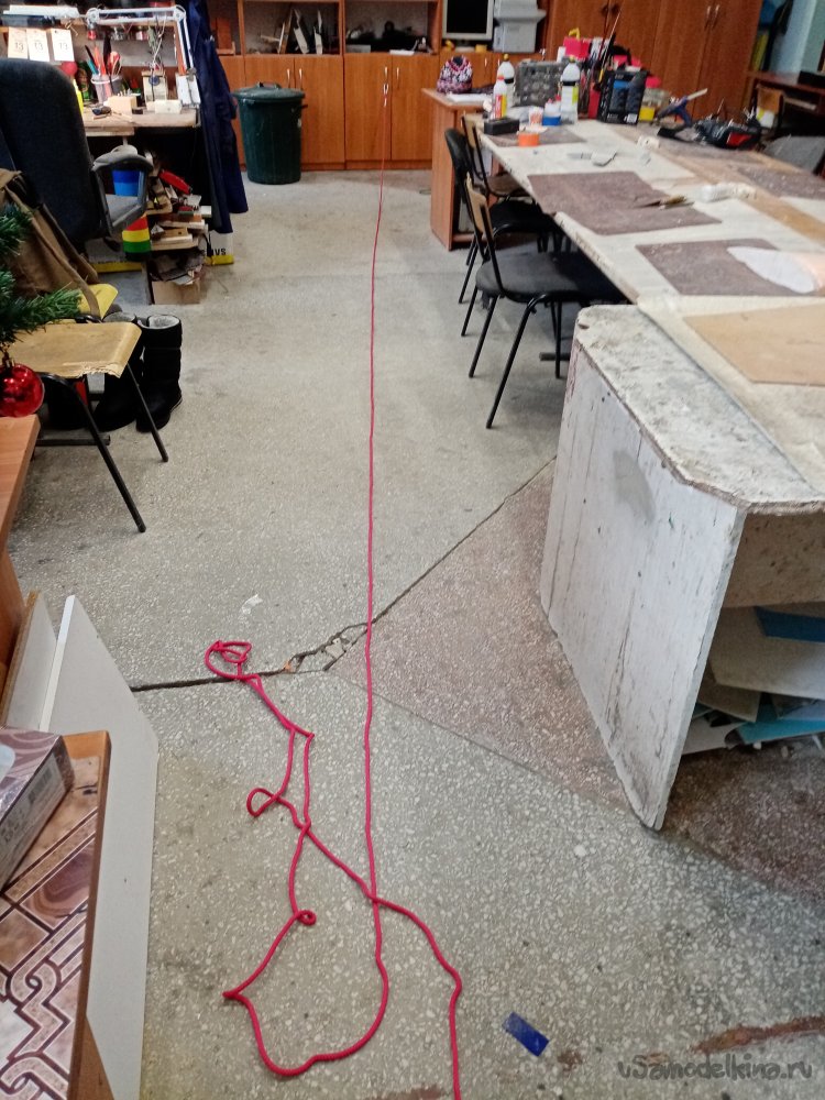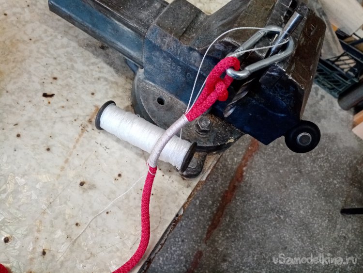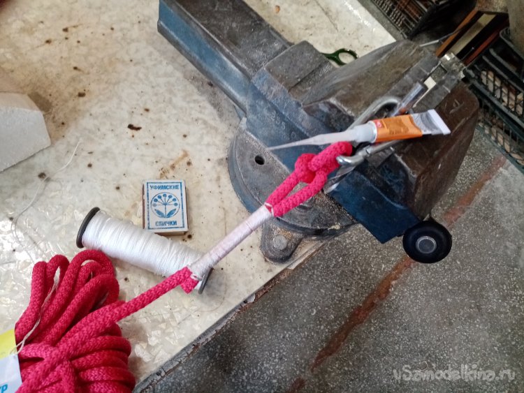 Катапульта готова. Нужно собрать новый запускающий элемент. Для этой цели закуплено 20 метров красивого красного шнура. Нормальной прочности. По расчетам усилие должно быт в районе 30-35 килограмм. Что позволит запустить массово-габаритный макет со скоростью в 50 км час. В момент отрыва от стола катапульты.