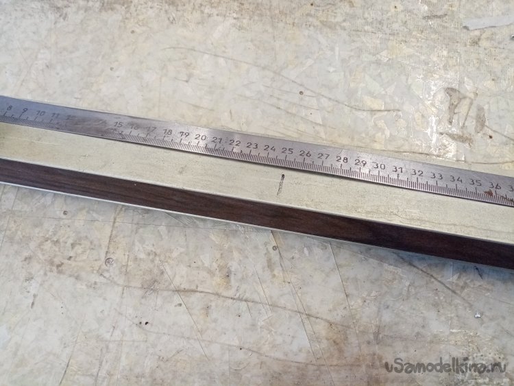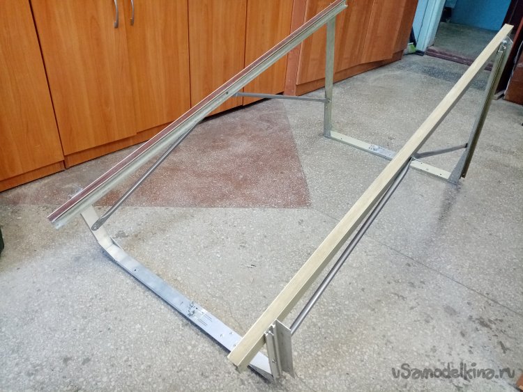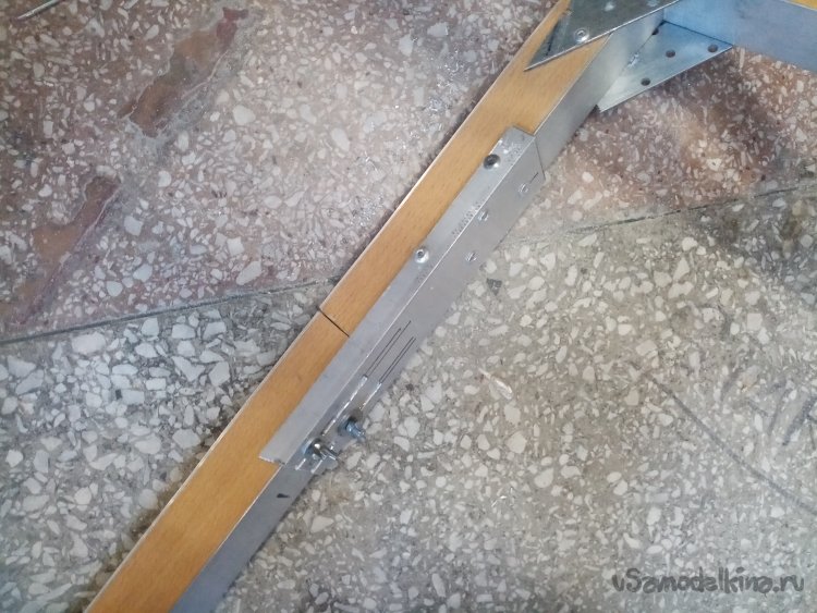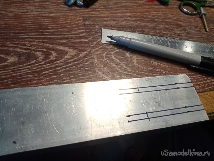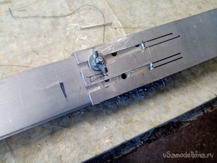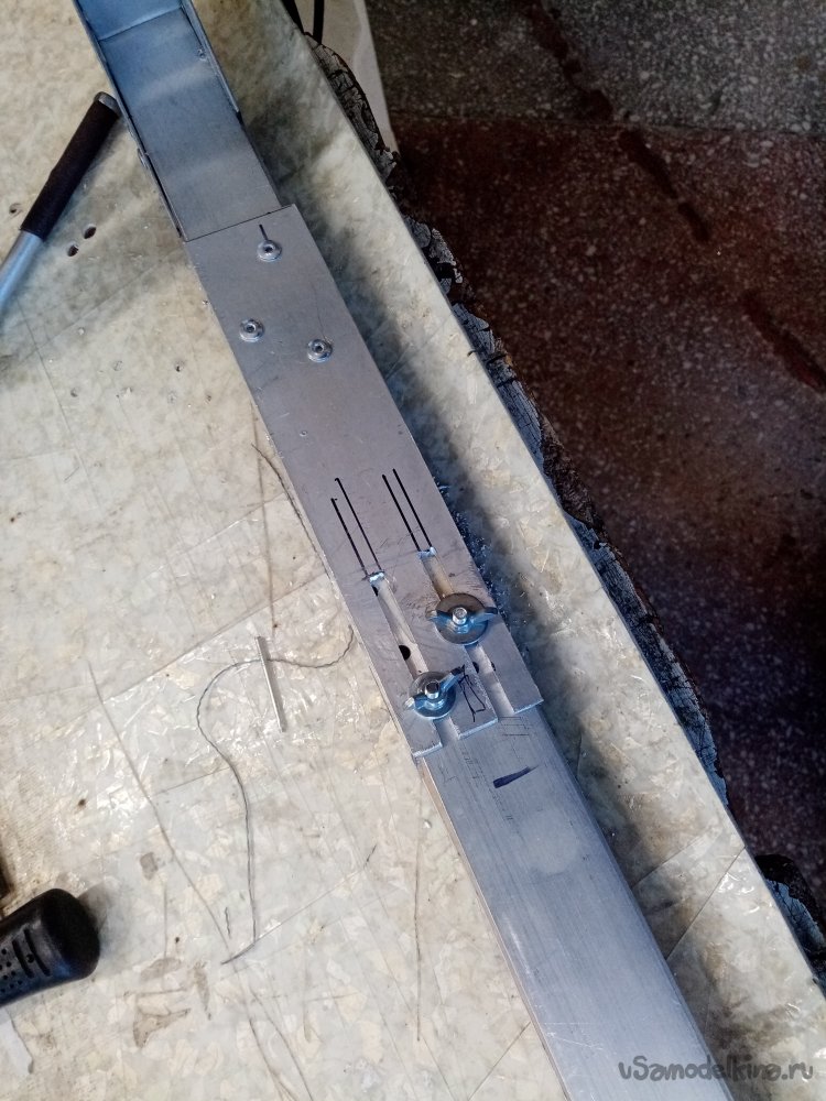 После некоторых сомнений решил разбирать катапульту в другом месте. Разрежу переднюю и заднюю раму пополам. Закреплю накладками. Все будет скрепляться парочкой барашков на каждом элементе. Разрезаю алюминиевую заготовку на нужный размер. Размечаю фломастером пазы.