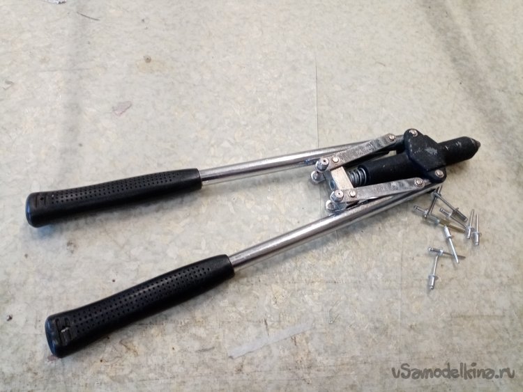 Заклепки устанавливаю при помощи такого большущего приспособления. Специально закупили, для металлических заклепок. Но в этом случае справлюсь на раз-два с алюминиевыми.