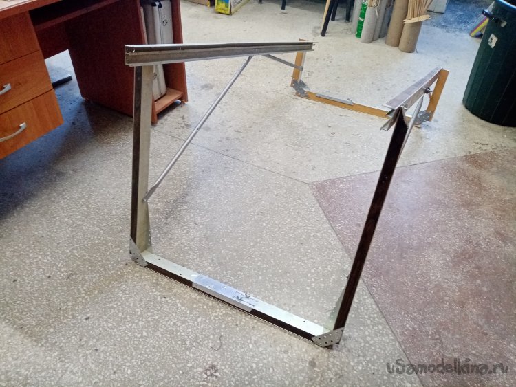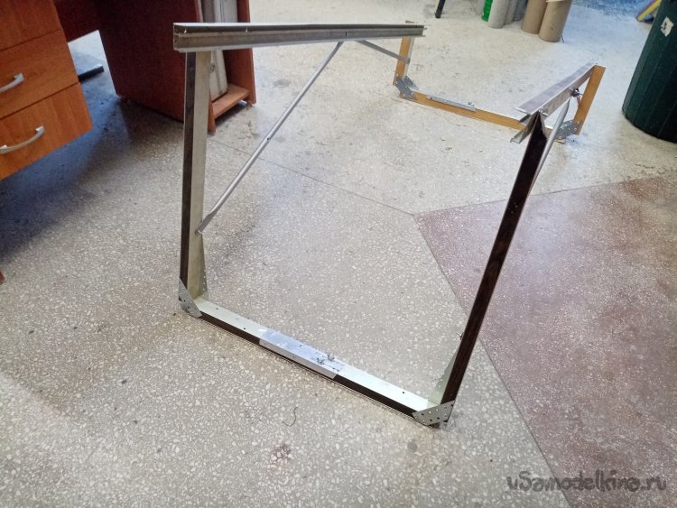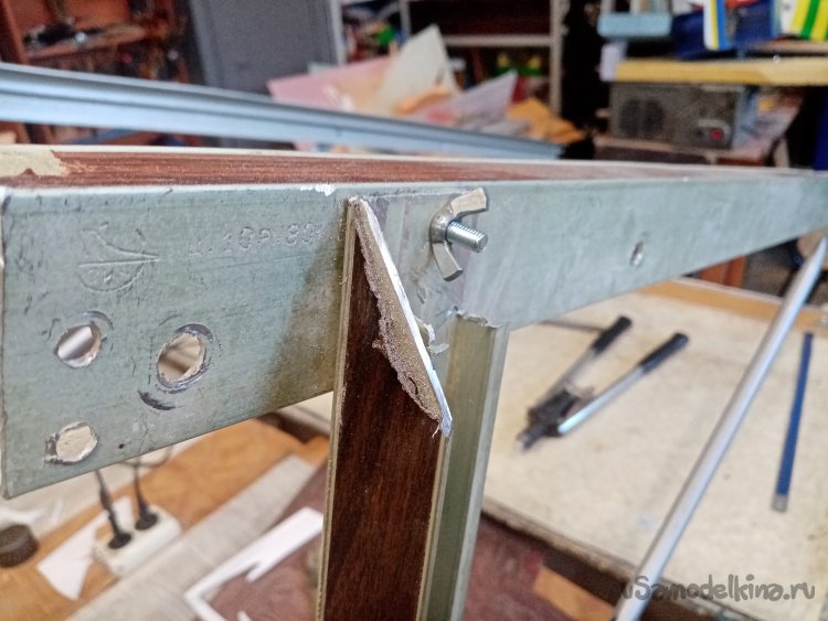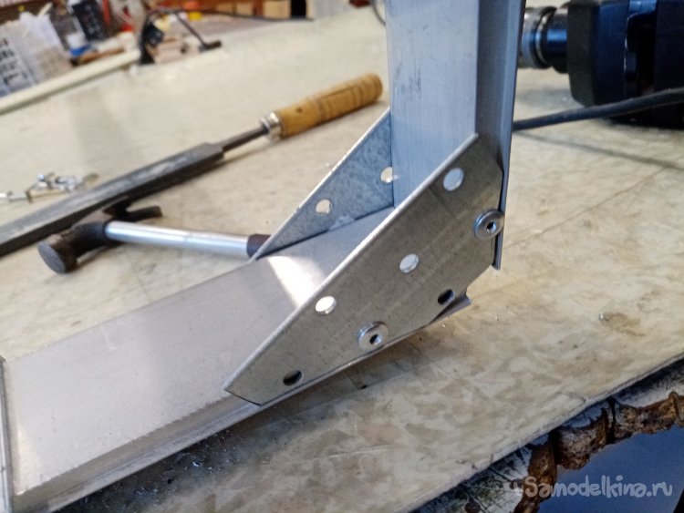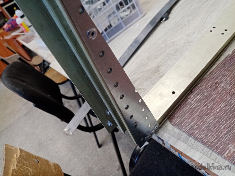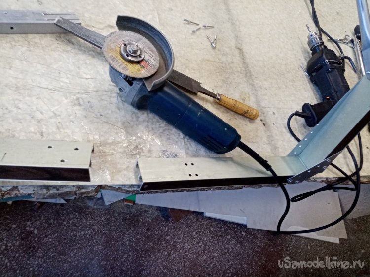 Разрезаю гардины на нужные заготовки. Парочку направляющих полтора метра. Две передних опоры высотой в 90 см. две задние опоры высотой в 50см. Болгаркой бодро режу уголки для усиления соединений. Затем в бой вступают заклепки. Сначала сверлю отверстие и устанавливаю одну, для фиксации. Затем засверливаюсь и заклепываюсь по полной программе по всему уголку.