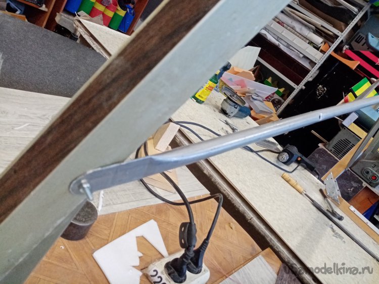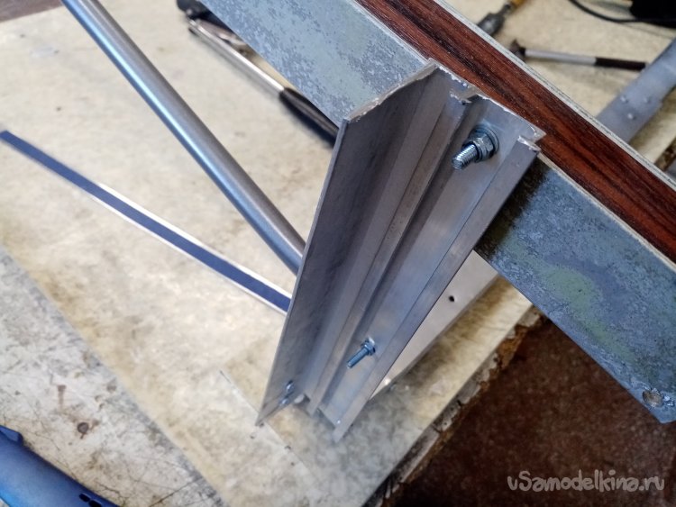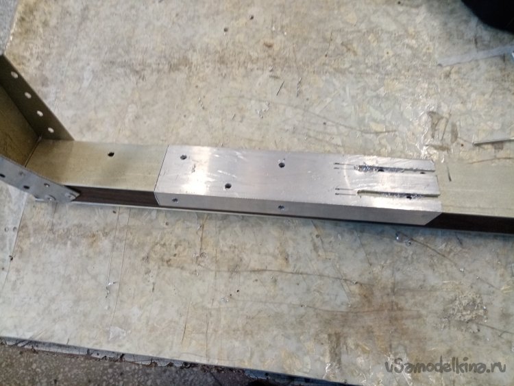 Соединяю с вертикальной задней стойкой направляющую. Сверлю отверстие на 5мм и болтиком соединяю заднюю раму, типа стойку с другой деталью. Вверху стойка немного выступает над поверхностью. Это будет крайняя точка размещения модели. Будет упираться рулем высоты. Затем все неровности немного сглаживаю напильником.