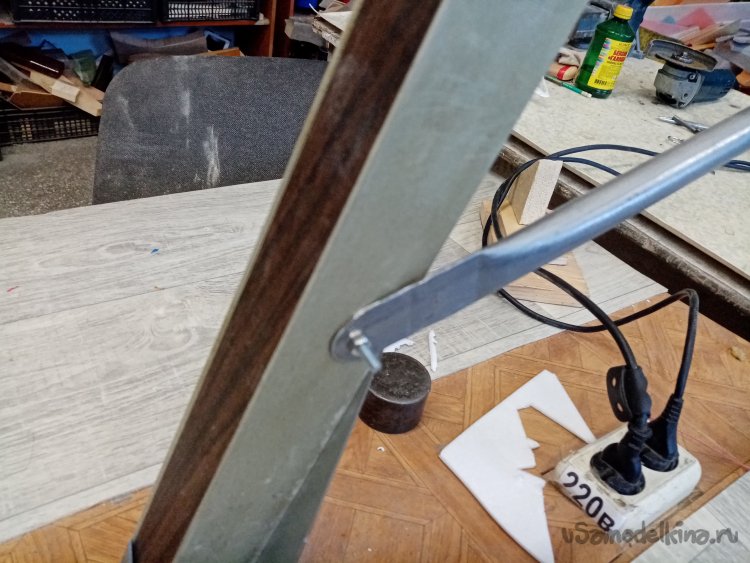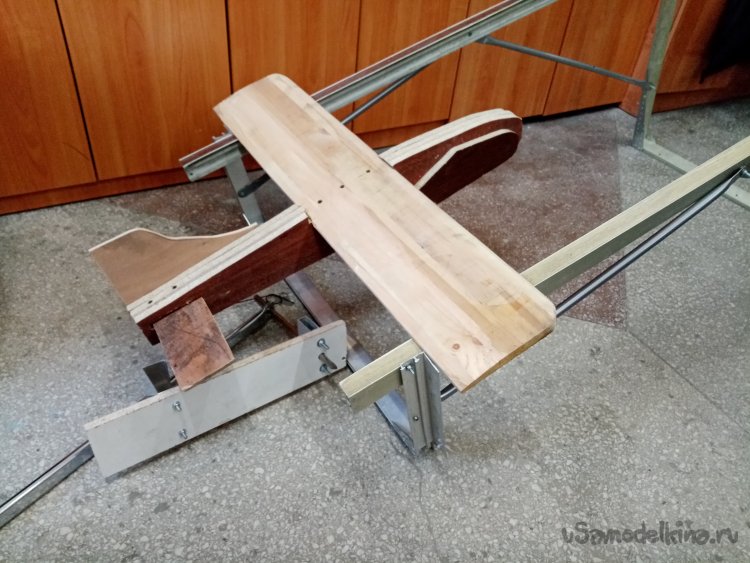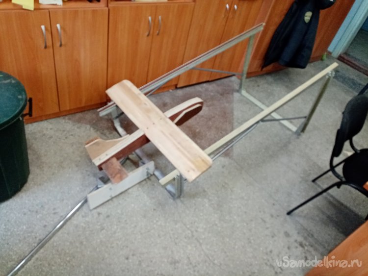 Последним элементом конструкции является пусковая педаль. Ее изготовил из остатков алюминиевой трубы сечением 40х80 мм. Металлического стержня диаметром в 10 мм, в качестве фиксирующего штыря. И самой педали из овальной трубы для вешалок из шкафа. Также предусмотрена чека безопасности. Которая извлекается перед стартом.