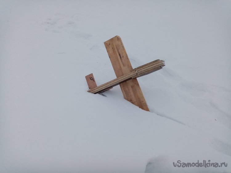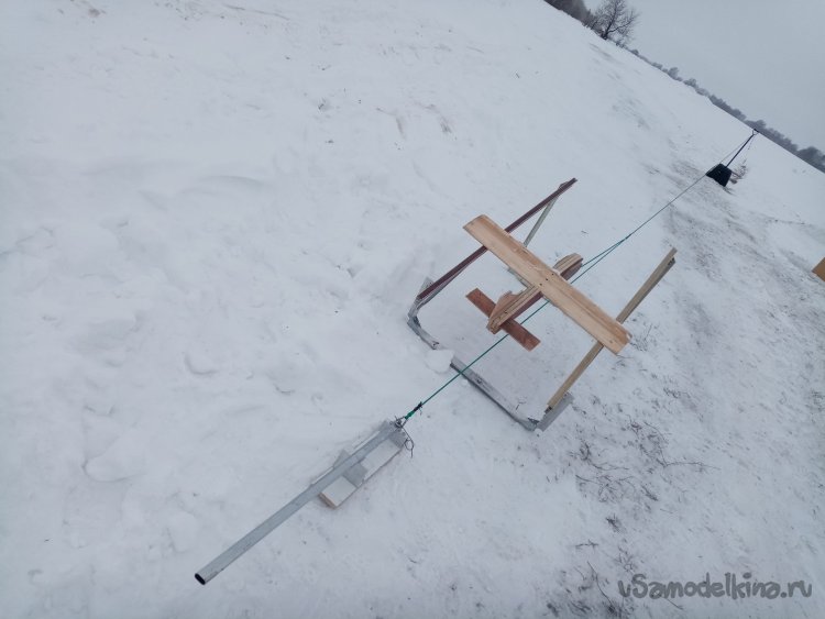 Практические испытания конструкции провели на заснеженном поле. Температура воздуха 18 градусов. Ветер 4м\с. Снежной лопатой прокопал траншею для шнура бросания. Её же использовал в качестве подставки. Для соответствия угла наклона катапульты и резинового шнура. Чтобы усилие жгута прилагалось по этой линии. Если он будет располагаться на земле, усилие прилагается не только по направлению полета , но и вниз. Это критично для крыльев, оперяющихся на направляющие.