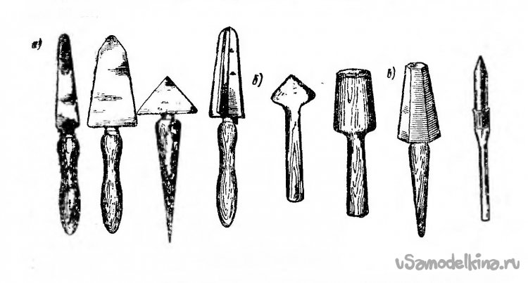 Рис. 2. Варианты разверток, где: а – крупного диаметра, с плоской металлической рабочей частью, в том числе и крестообразная в сечении; б – с обугленной деревянной рабочей частью; в – графитовые [1]. Заметим, последняя в ряду – нетолстая графитовая развертка со стеклянной ручкой