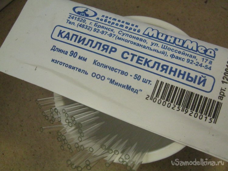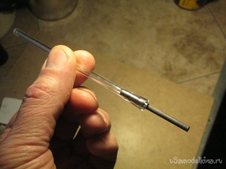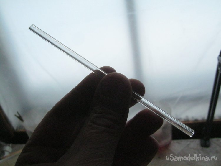 Фото 8. Из своего небогатого ассортимента стеклянных заготовок-трубок выбрал стандартную штенгельную – внешним диаметром 5 мм из платинового стекла. Отрезал от 1.5 м заготовки подходящий кусочек – чиркнул поперек трубки ребром алмазного надфиля, сломал
