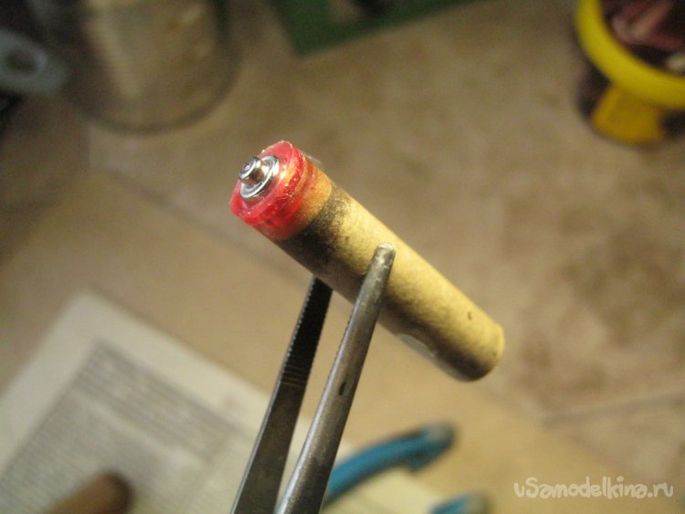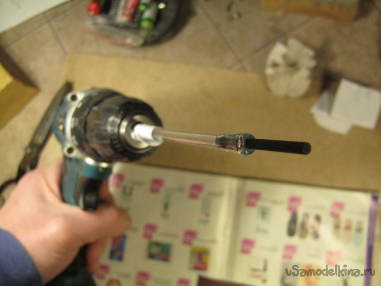 Фото 17. Заточку тела вращения удобнее механизировать. Конец трубочки обернул полоской принтерной бумаги и аккуратно установил в патроне шуруповерта