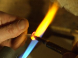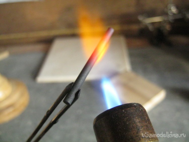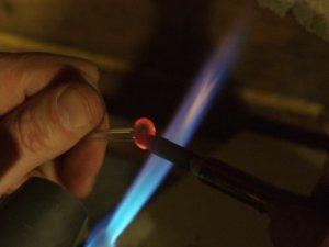 Фото 10. Платиновое стекло, относительно легкоплавкое и дешевое, но не самое удобное для ручной выделки на горелке – имеет высокий коэффициент температурного расширения (КТР) и оттого склонно к термоударам. Тем не менее, нетолстую трубочку можно вносить в пламя пропан-воздушной горелки почти сразу – напряжениям тут разгуляться негде. Трубочку всё время вращаем, в том числе и вне пламени – для равномерного остывания. Вначале оплавляем один из резов и кладем на подставку остывать. Мелким работам охлаждение можно не замедлять (укутывание, разогретая печь, охлаждение в коптящем пламени). Яркий оранжевый хвост – т. н. содовое свечение – окрашивание пламени испаряющимися с поверхности разогретого стекла ионами натрия. Для глаз вредно и мешает работать. Его невидно в специальных очках-светофильтрах с неодимовыми (дидимовыми) стеклами