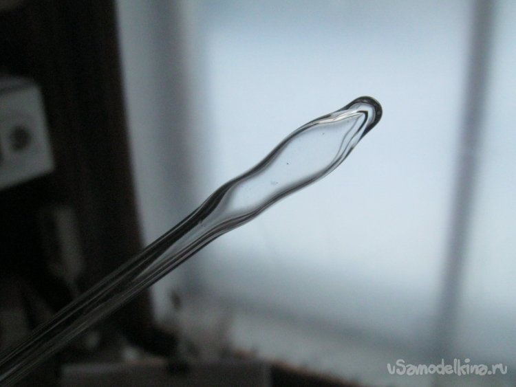 Фото 16. Остывшая работа. Заметим – нижний конец ручки открыт. Иначе при горячей обработке стекла, разогретый расширяющийся воздух будет раздувать где не нужно несимметричные пузыри. При работе инструмент придется тоже нагревать
