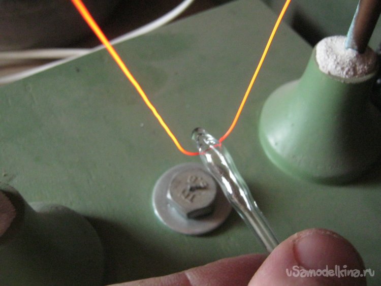 Фото 13. Чиркнув алмазным надфилем, прикладываем эту риску к накаленной нихромовой проволоке электрорезки