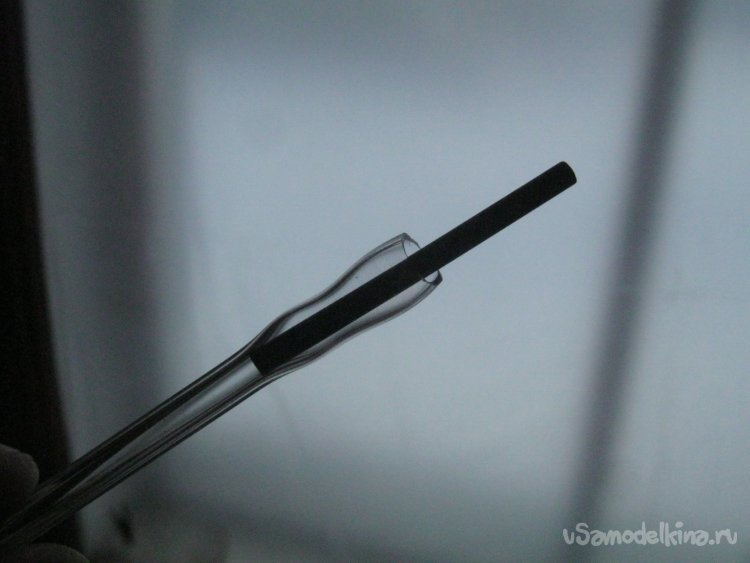 Мой графитовый стержень чуть толще канала трубочки – придется организовать для него нарочитое посадочное место. Последовательность работы – оплавить острые торцы трубочки (очень полезное «правило хорошего тона»), заплавить один из ее концов, раздуть на нем этакую оливку – продолговатое расширение для рабочей части инструмента.