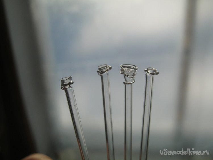 В отличие от плоских своих коллег [1], сплошные развертки в разогретую трубку втыкаются соосно. С крохотными тонкостенными капиллярами действовал так – в негорячей части факела слегка разогревал кончик капилляра, не допуская его заплавления, и тут же втыкал в него острие развертки. Втыкание в холодную трубку царапает рабочую поверхность, ее придется часто править. Не вынимая развертки из заготовки, разогревал кончик графита до малинового свечения. Инструмент и трубку при этом непрерывно вращал в разные стороны для равномерного нагрева. Небольшой нажим, и сформована аккуратная толстостенная вороночка по форме острия развертки. Без смятия и перекручивания стекла. Операция замечательно повторяемая, брака очень мало.