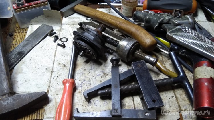 Подшипник 6001ZZ, съёмник, шуруповёрт, дремель, борфрезы, ножницы по металлу, листовая сталь, напильники и наждачная бумага, ветошь и смазка консистентная. Ну и по ходу ремонта подручные средства, выколотки, тиски для запрессовки подшипника и шестерни, моющие средства и т.д.