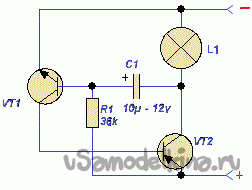 Оригинальную схему я нашел в интернете по поиску картинок, она предназначена для работы с лампочкой. Но я эту схему решил переделать на светодиод, также привожу свои номиналы деталей, просто вариант, как у меня все получилось.