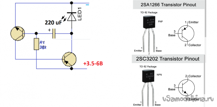 В этой схеме можно настроить интенсивность мерцания просто подбором конденсатора и резистора. Также в теории такую схемку можно разогнать до большой частоты, тут уже все зависит от транзисторов. Транзисторы я выбрал первые попавшиеся из старого радио-барахла.