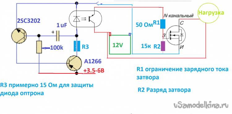 Также ставим резистор для разрядки емкости затвора, тем самым его закрывая.