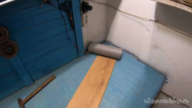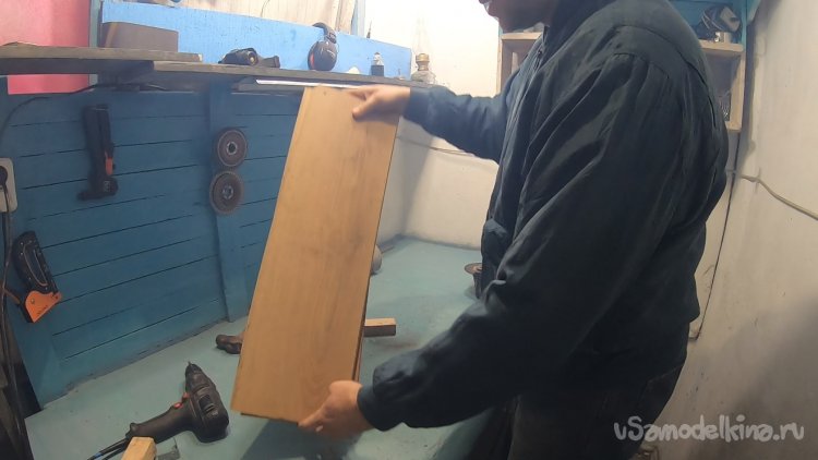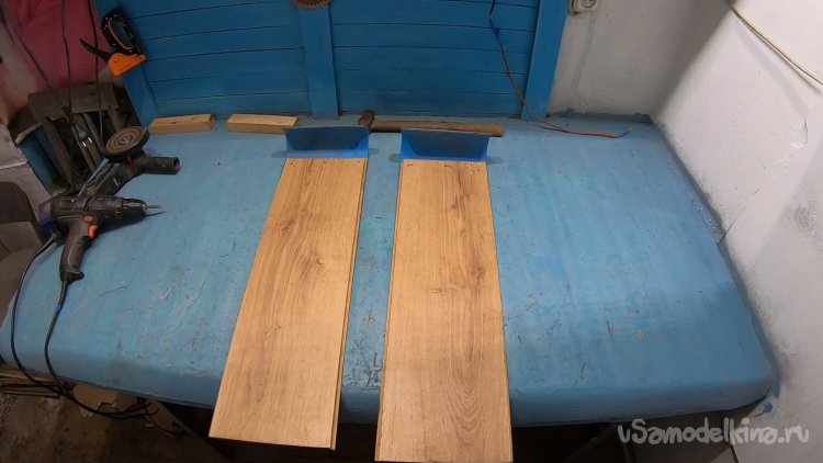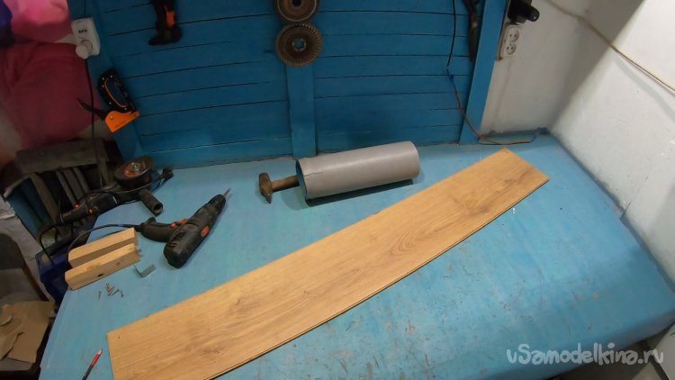 Первым делом нужно отмерить нужной длины куски ламината. Визуально я выбрал 65 см, на практике это оказалась минимально возможная длина, то есть можно и длиннее. Резал я ламинат болгаркой, не имея другого инструмента кроме ножовки. Не считая дыма, режется нормально.