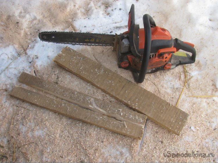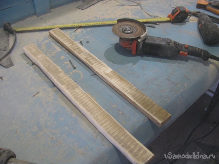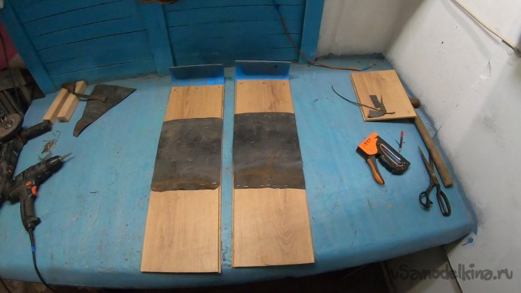 Для решения задачи были вырезаны стабилизаторы линейной устойчивости, или просто говоря – бруски, которые прикрутил вдоль ламината. Бруски я вырезал из доски. С брусками укрепилась вся конструкция, а снегоступы уже стали почти не скользкие. Именно для передвижения можно добавить еще поперечные ребра.