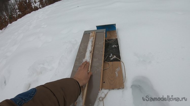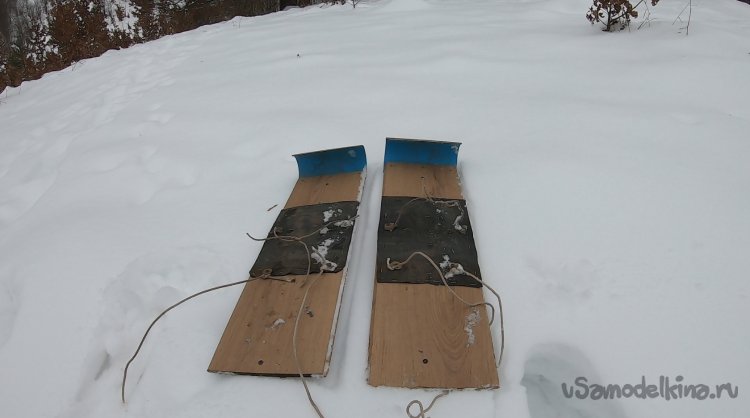 Над креплениями к ноге я пока не стал заморачиваться и использовал просто веревки. Недостаток веревок в том, что нога может поворачиваться на такой лыже, к тому на морозе неприятно их развязывать и завязывать.
