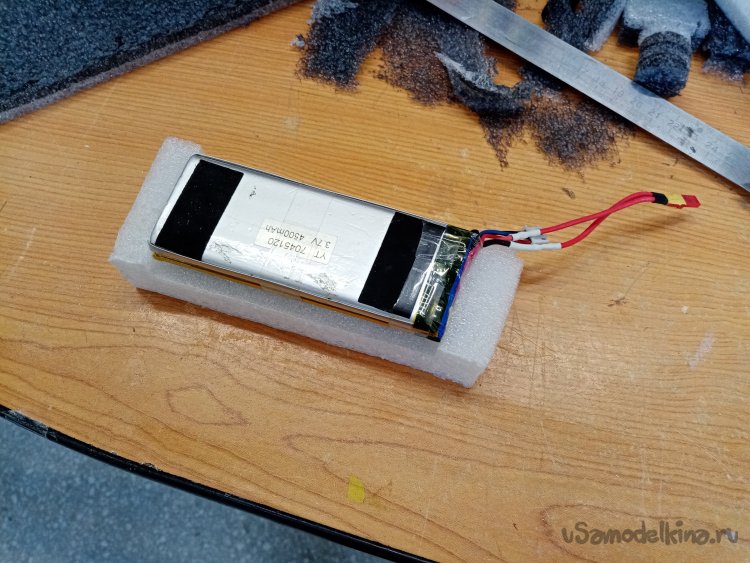 Из прошлой жизни мне остался совершенно замечательный аккумулятор на 4500 мач. Вернее даже четыре. Приспособил их для питания пульта спаял в пару. Получилось 7.4 вольта. Один на пульте, второй вкладываю про запас. Во избежание.