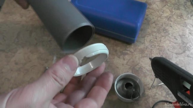 Первым делом нам необходимо разобрать наш старый фонарик. Из него нужно вытащить все внутренности, а также отрезать верхнюю резьбовую часть, которую нужно приклеить к трубе.