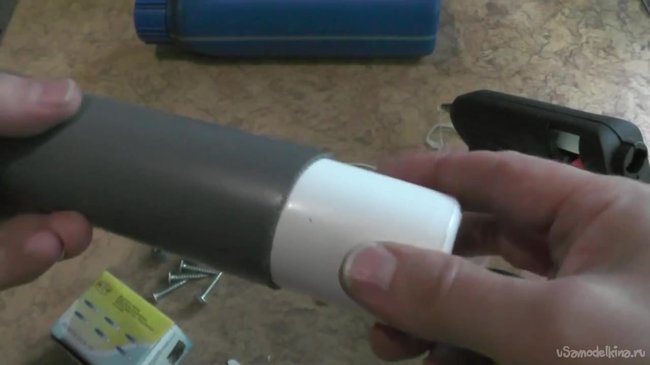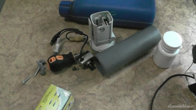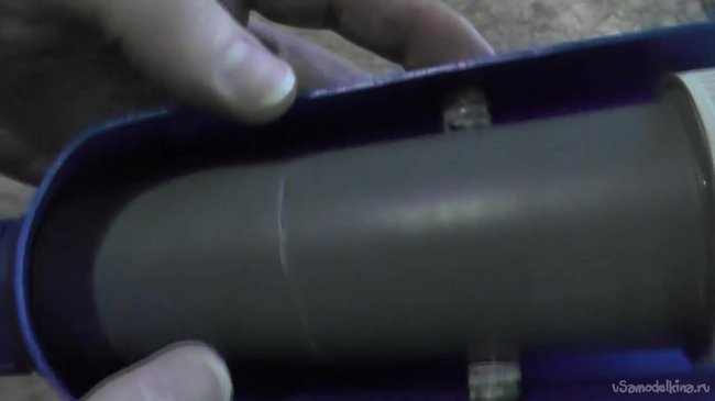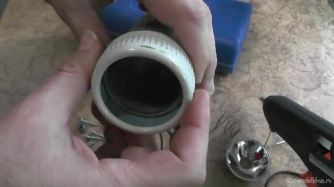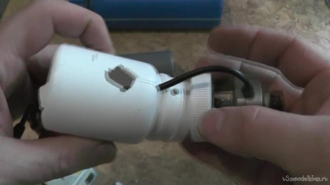 Далее засовываем баночку с камерой в канализационную трубу, которую перед этим следует разделить на две части. Вторая часть, которая поменьше должна использоваться для изоляции проводов нашей камеры от влаги. Сам объектив камеры прикрываем резьбовой частью фонарика.