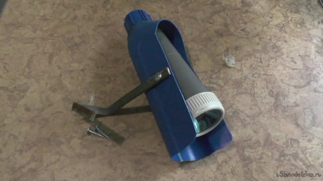 Для большей защиты и имитации реальной камеры, нужно отрезать кусок от старой тары от автомобильного масла, как показано на фотографии. Конструкция из тары позволит защитить камеру от солнечных лучей, а также от влаги.