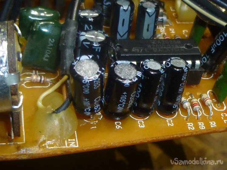 Не понравилось состояние проходных конденсаторов C1, C6. Таких на 16 В у меня не было, впаял 100 мкФ х 35 В (чуть-чуть великоваты по размеру, но влезли).