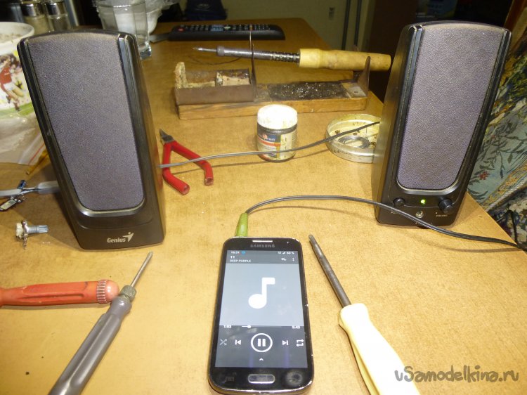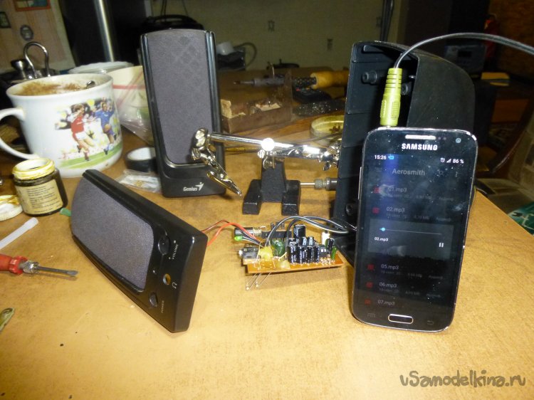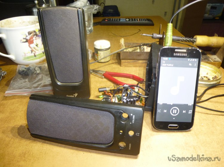 Добрый день, друзья Самоделкины! Образовалась маленькая проблемка (если честно, то ещё два года назад образовалась) — не работают компьютерные колонки. Ну, как не работают: одна хрипит, будто её душат, а вторая молчит, как “рыба об лёд”. Свои основные колонки (очень хорошие, там даже “surround” и турбо-бас есть!) я увёз пару лет назад на дачу, где подключил к TV-приставке — теперь смотрю на даче телек с комфортом. А вот дома телевизоры плоские и со стереозвуком. Да вот незадача: понакачал новых фильмов с Интернета, а какие оставлять в коллекции — не пойму, посмотреть сначала надо. А на ноутбуке, сами знаете, какая акустика. Полазил, поискал простенькие колонки в Интернете. Стоимость начинается от 750-800 руб., причём с питанием от USB. А у меня фактически все порты заняты на ноутбуке. С питанием от сети цена переваливает за 1500 руб. Жаба душит — это же сколько хорошего пойла можно купить!