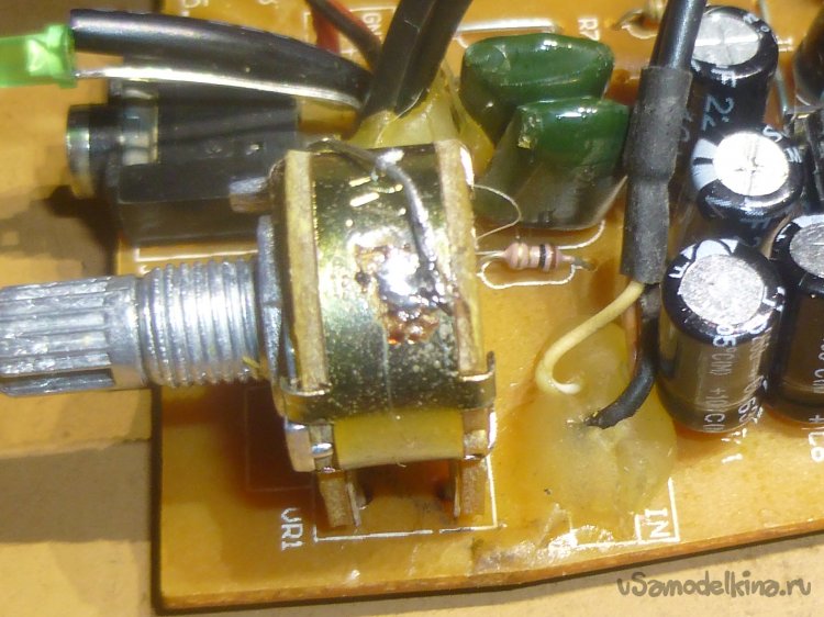 Да, выпаять этот потенциометр был ещё тот квест! И выпаять с претензией на починку (то есть, не повредив)! Иголкой тут не воспользуешься — ножки слишком толстые. Но, справился — потихоньку-полегоньку выпаял. Фу-у…