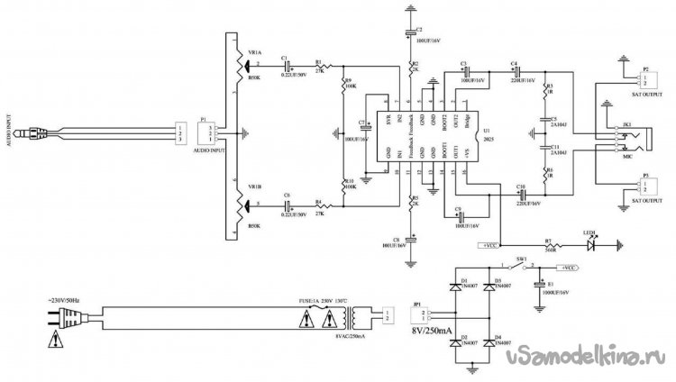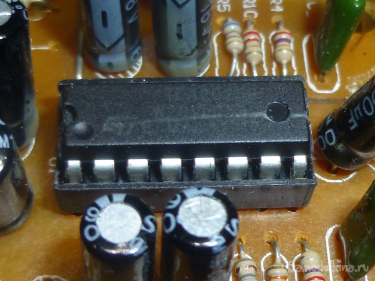 Что у нас там есть. Усилитель построен на микросхеме TEA2025B. Схемка простая донельзя — всего несколько деталюшек, которые служат обвесом микросхемы, в основном, конденсаторы. Осциллографа и генератора, естественно, в наличии у меня нет. Попробовал “профонить” 7-ю и 10-ю ноги микросхемы соответственно (тыкал щупом на ножки, закоротив щуп пальцем). Одна колонка “рычит”, вторая молчит. Кстати, молчит та, в которой расположена плата со схемой и трансформатор. Не от того ли, что схема перегревается от трансформатора, на первичную обмотку которого постоянно приходит напряжение? Значит дело в микросхеме. Микросхемы такие точно были в загашнике (когда-то покупал на AliExpress для чего-то).