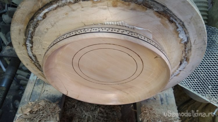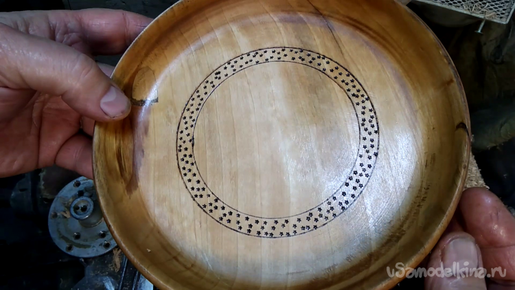 После точения решил украсить орнаментом. Самый простой способ нанести полоски на вращающейся заготовке нихромовой проволокой. Просто прижимаю проволоку, за счёт трения она нагревается и прижигает полоски. А вот внутри тарелки такой способ не проходит, даже раскалённая проволока на оборотах около полутора тысяч в минуту не может нагреть дерево до обугливания, просто протачивает. Поэтому приходится вращая заготовку руками рисовать окружности. Но качество получается средненькое.