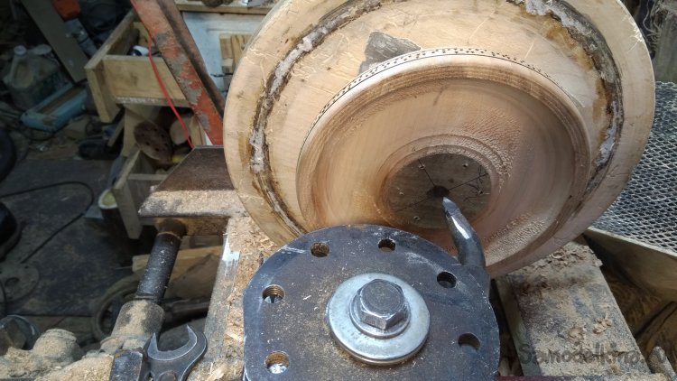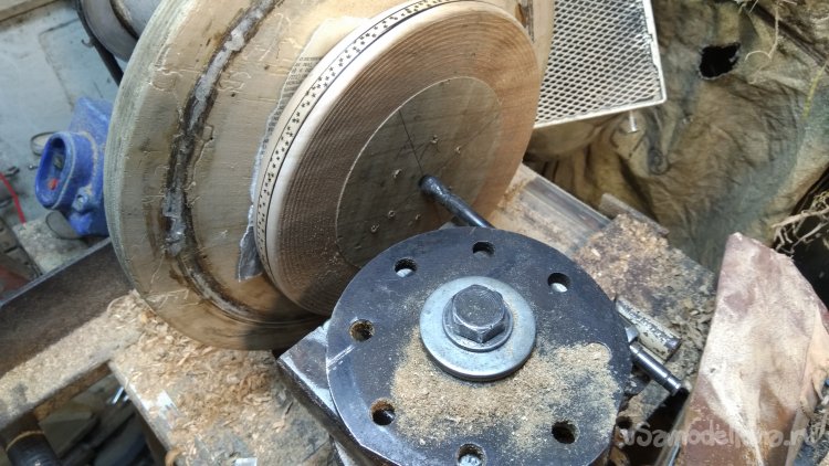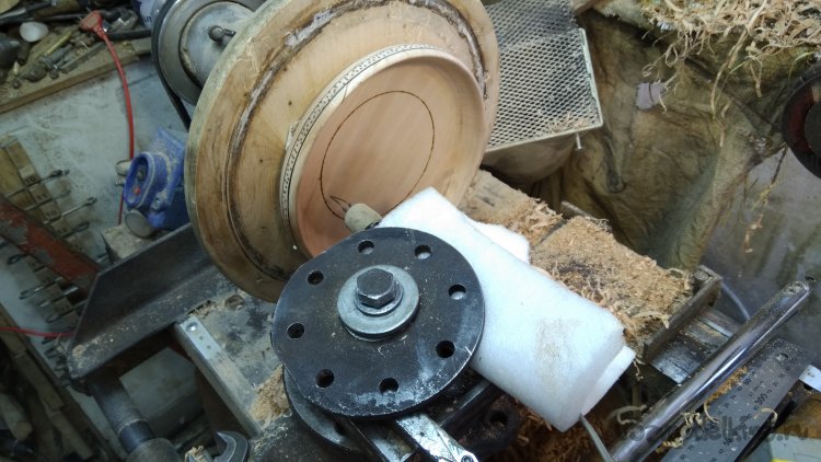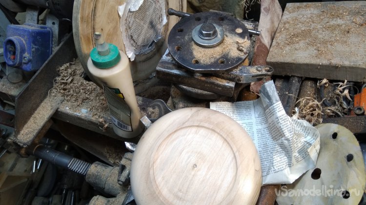Далее на фанерную планшайбу приклеиваю через газету заготовку для протачивания углубления в тарелке.
